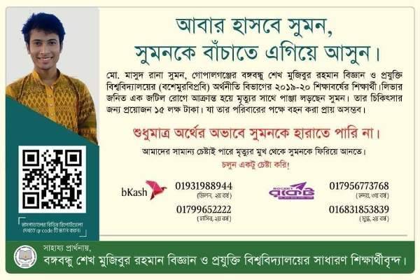 গত প্রায় দুই মাস আগে বশেমুরবিপ্রবির অর্থনীতি বিভাগের প্রথম বর্ষের শিক্ষার্থী মো. মাসুদ রানা সুমনের যকৃত জনিত জটিল রোগ ধরা পড়ে, তাৎক্ষণিক উন্নত চিকিৎসার জন্য ডাক্তারের পরামর্শ অনুযায়ী ১৫ লক্ষ টাকার প্রয়োজন হয়। কিন্তু সুমনের পরিবার আর্থিক ভাবে অসচ্ছল হওয়ায় টাকার যোগান দিতে পারছিলনা। তৎক্ষণাৎ সুমন বিশ্ববিদ্যালয়ে তার বিভাগে, সহপাঠীদের সাথে, সিনিয়র শিক্ষার্থীদের সাথে যোগাযোগ করলে বিশ্ববিদ্যালয় থেকে সুমন সাহায্যের আশ্বাস পায়।