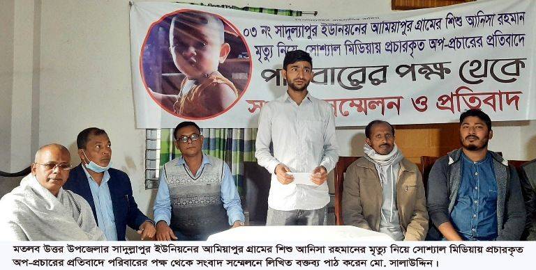 চাঁদপুরের মতলব উত্তর উপজেলার সাদুল্লাপুর ইউনিয়নের আমিয়াপুর গ্রামের শিশু আনিসা রহমানের মৃত্যু নিয়ে সোশ্যাল মিডিয়ায় প্রচারকৃত অপ-প্রচারের প্রতিবাদে পরিবারের পক্ষ থেকে সংবাদ সম্মেলন করা হয়েছে।