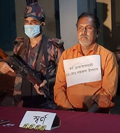 দিনাজপুরের হিলি সীমান্তে দিয়ে ভারতে পাচারকালে ৪ পিচ স্বর্ণের বার সহ নজরুল ইসলাম নজু (৫০) নামের এক স্বর্ণ চোরাকারবারীকে আটক করেছে বাসুদেবপুর ক্যাম্পের বিজিবি সদস্যরা। বিজিবি ২০ ব্যাটালিয়নের অধিনায়ক কর্ণেল রফিকুল ইসলাম ৪ পিচ স্বর্ণের বার সহ নজরুল ইসলামকে আটকের সত্যতা নিশ্চিত করেছেন।