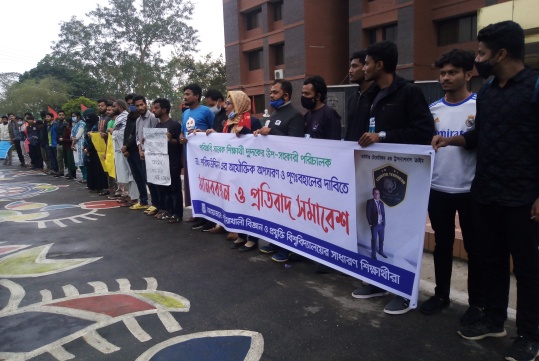 পবিপ্রবি’র সাবেক এ এন এস ভিএম এর ৩ য় ব্যাচ এর শিক্ষার্থী ও দুদক কর্মকর্তা শরীফ উদ্দিনকে চাকুরিতে পুনর্বহাল ও চাকরিচ্যুতির বিতর্কিত ধারা ৫৪(২) বাতিলের দাবিতে মানববন্ধন করেছে পটুয়াখালী বিজ্ঞান ও প্রযুক্তি বিশ্ববিদ্যালয়ের (পবিপ্রবি)শিক্ষার্থীরা।