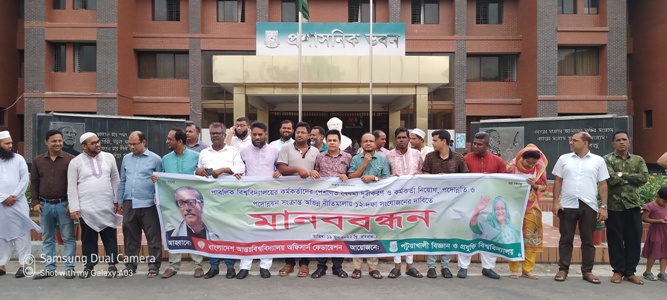 বাংলাদেশ আন্ত:বিশ^বিদ্যালয় অফিসার্স ফেডারেশনের উদ্যোগে পদোন্নয়ন ও পর্যায়োন্নয়নসহ ১২দফা দাবিতে পটুয়াখালী বিজ্ঞান ও প্রযুক্তি বিশ্ববিদ্যালয় (পবিপ্রবি) ক্যাম্পাসে ১ঘন্টার মানববন্ধন কর্মসূচি পালিত হয়েছে।