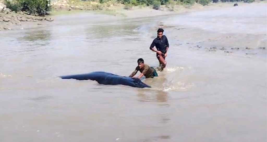 নোয়াখালীর দ্বীপ উপজেলা হাতিয়ায় মেঘনা নদীতে জোয়ারের পানিতে ভেসে এসেছে বিশালাকৃতির একটি তিমি।